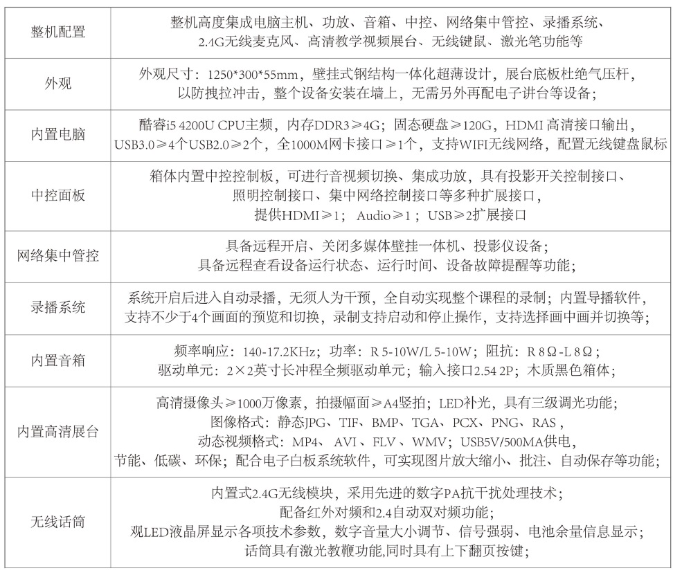 智能中kòng控主機既支zhīchí持lù錄播圖像及shēng聲音的採集,同shí時也zhī支持教學使用,搭配電diànzi子自板、超短焦tóu投影機以及jíshè攝像tóu頭,通過jiào教學PPT等hàoVjiēGA信號接入lèixìn及對各類信,號的整合,實現課堂教chéng學的lùzhì全,過程錄製,生成xué高質pín量教學視頻課件。